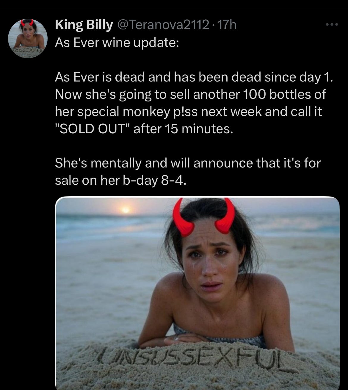 As you can see here, they claim that as ever is dead and yet we just had Meghan Markle restocking the wine yesterday. If you’re on X and you see this profile block them immediately because they are telling fake stories.